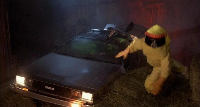 Марти, одетый в радиационный костюм, спотыкается, покидая ДеЛориан.