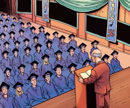 Vice Principal Strickland speaks to the Hill Valley High School graduating class of 1956.