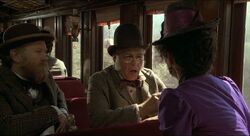 The barbwire salesman and his companion both had a discussion about the man that the salesman had met the night before, and the woman that left him. When the second man mentioned her name, Clara Clayton overheard and questioned them about Dr. Emmett Brown, before she pulled on the emergency brake and stopped the train.