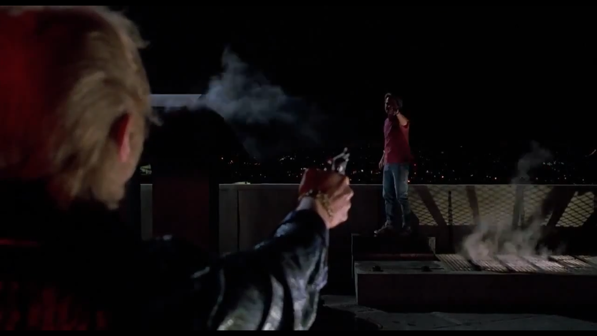 Marty is cornered by a gun-wielding Biff on the roof of Biff Tannen's Pleasure Palace.