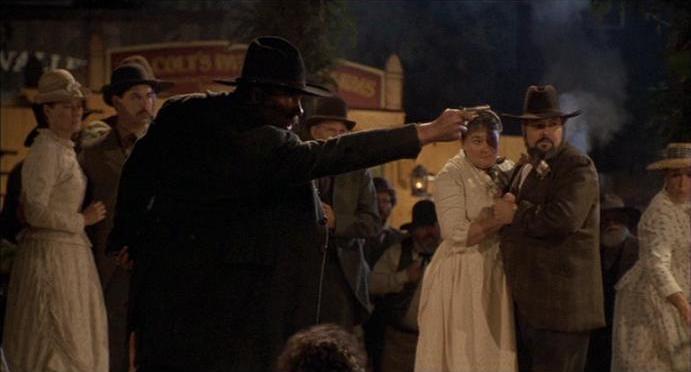 At the festival two days later, Doc escaped being shot in the back by Buford, as he now knew about it from Marty. Marty saved Doc from Buford's fatal shot by throwing a Frisbie Pie Company tin in the manner of a frisbee, deflecting Buford's shot which blew Doc's hat away. After hearing an unfamiliar phrase that he assumed to be an insult (it was; Marty yelled "Hey, lighten up, jerk!"), Buford challenged 'Clint' to a shootout Monday morning. Marty initially started to walk away, but Buford called him "yellow". Marty, whose one weakness was an insecurity about being thought of as a "chicken", unwisely agreed to square off against Buford. Familiar with Westerns, Marty assumed that the showdown would take place at "high noon", and was surprised when Buford set the time as 7 o'clock in the morning. Buford bragged, "I do my killing before breakfast." 'Mr. Eastwood' calmly responded that "I do my killing after breakfast," and got a minor concession of an hour by setting the challenge for 8 o'clock. As Seamus pointed out correctly, Marty had allowed Buford to manipulate him.