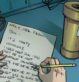 Marty writes a letter to Doc to put in a canister (on the far right).