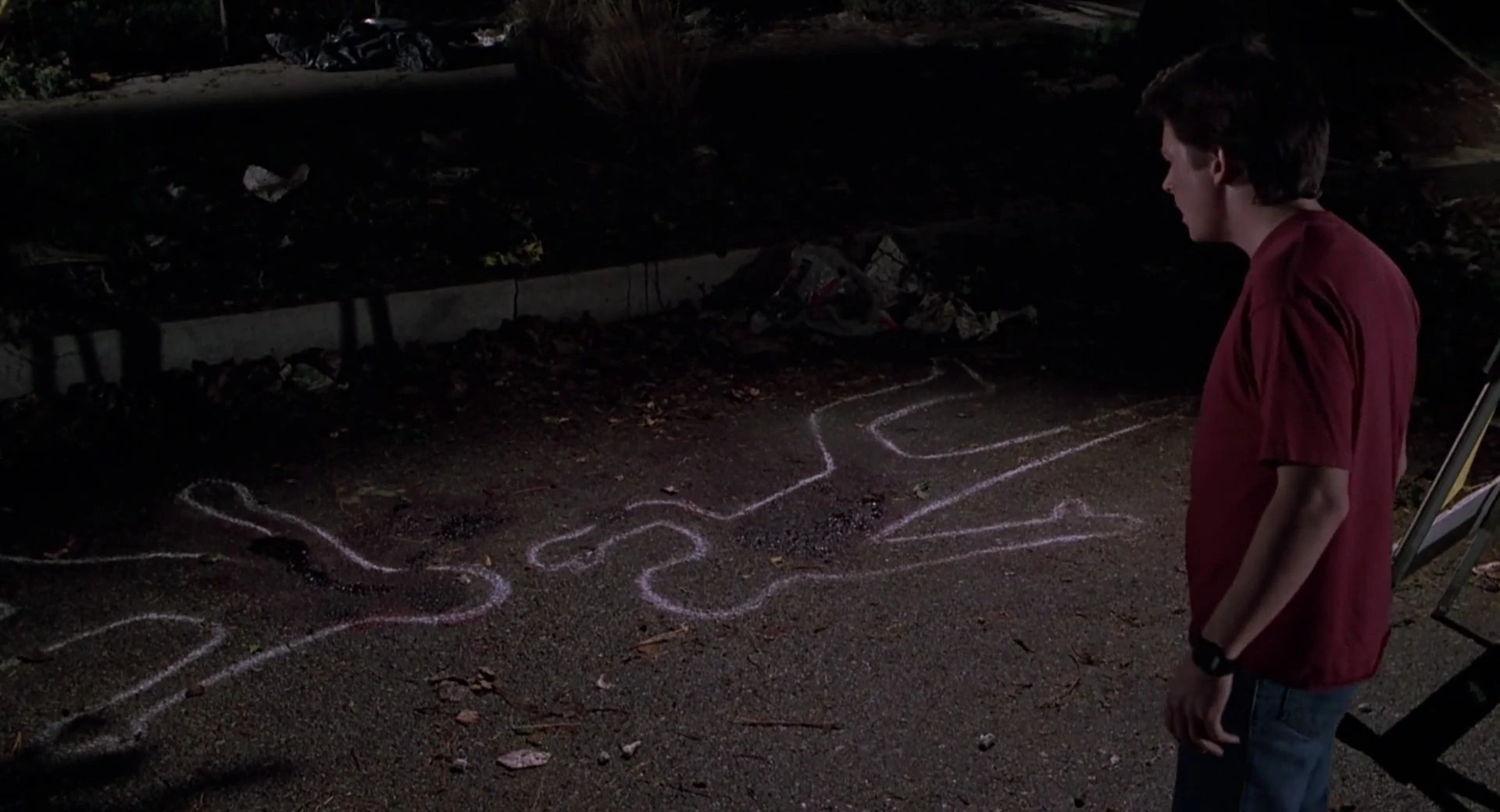 Marty spots the chalk outlines of two victims of a drive-by shooting in 1985A.