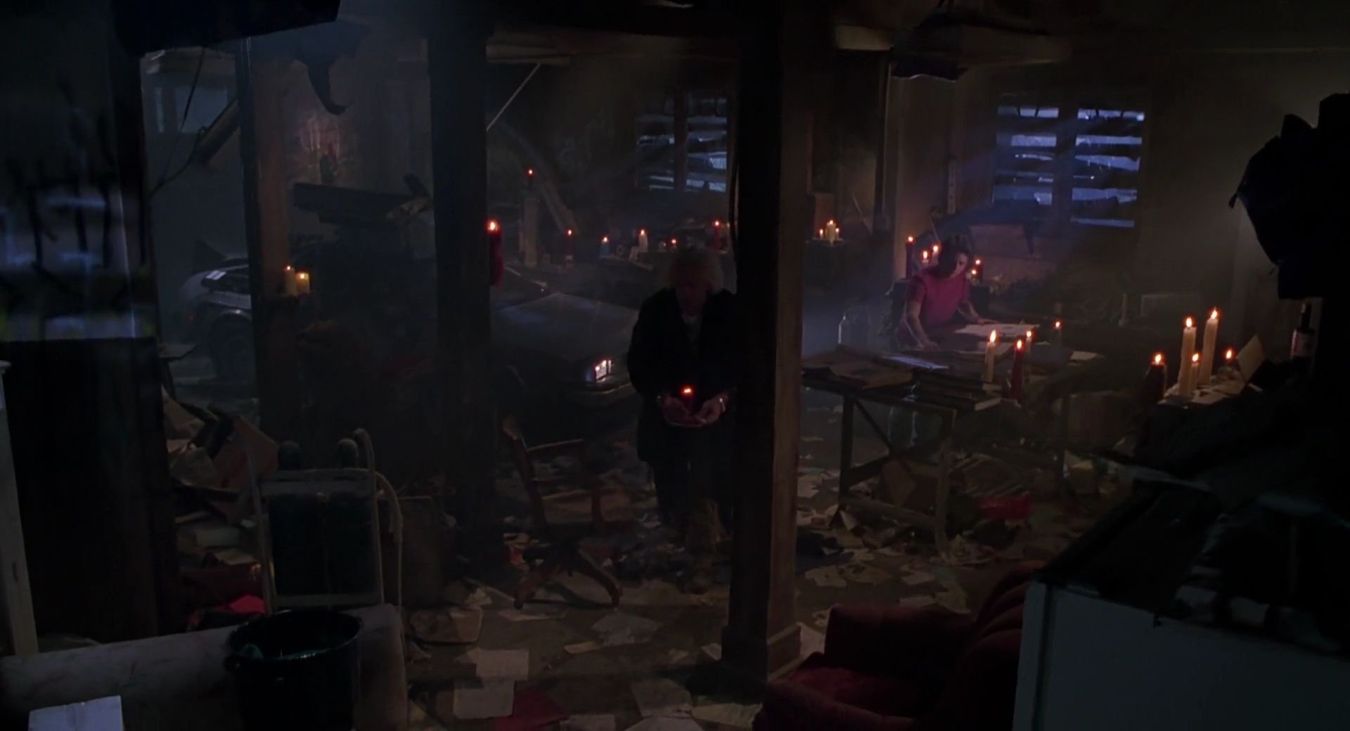Marty, Doc and the DeLorean time machine inside the abandoned and trashed garage in 1985A.