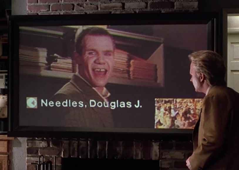 - "He [Marty] picked up the remote control and banished the art channel painting to the corner of the screen. / Needles smiled his gap-toothed grin as his head and shoulders filled the rest of the video display and his identification code flashed on: NEEDLES, DOUGLAS J. ADDRESS: 88 ORIOLE ROAD. A6TB-94. That was his home address; not that Needles was ever home. From the row of vidmemos behind him, Marty could tell the other man was still at his station at work. Sometimes Marty wondered if Needles ever left the office."