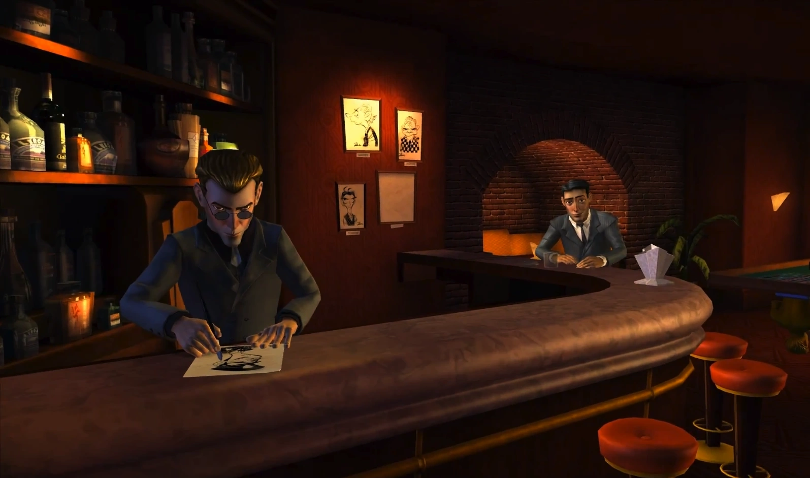 Access to the speakeasy was restricted to only those that gave successful passwords at the door, guarded by Matches. Downstairs, a stage was set up for Trixie Trotter to perform, with a piano played by Cue Ball, and a bar tended by Zane. Up on the wall were caricatures of people, called the "Wall of Fame", whom Kid had killed personally. One of the drinks served was McDermott's Canadian Whiskey.