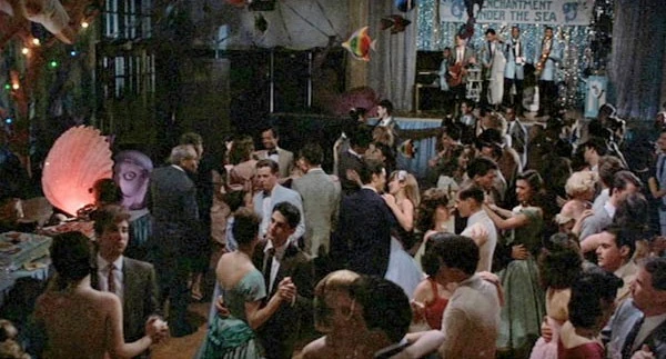- " "Enchantment Under the Sea was well underway. The Hill Valley High School Gymnasium still looked basically like a gymnasium, but there were enough displays and artifacts to create a pleasant illusion. The lighting was blue with silver sparkles created by glass mobiles cut in the shape of fish. Against the walls were various papier-mâché attractions — a sunken ship, undersea caverns, a treasure chest, masses of seaweed, and a diver suspended by a long cable reaching to the ceiling. As an example of contemporary humor, a single school locker labeled "Davey Jones" occupied one corner of the huge room. "