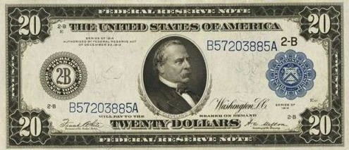 Cleveland was added to United States currency in 1914, on the $20.00 bill. In 1928, the $20.00 Cleveland bill was replaced by one featuring Andrew Jackson, and Cleveland was moved to the $1000.00 bill. In 2020, the Jackson $20.00 bill was replaced by one featuring Harriet Tubman.