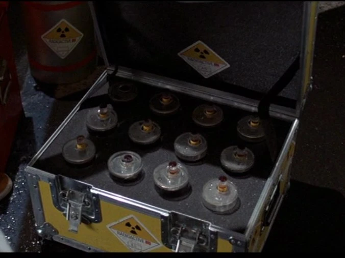Dispensing the plutonium into the DeLorean required use of a full radiation suit. After twisting and removing the reactor cap, a container could be inserted and then rotated into place, causing the vial to drop into the fuel slot. Once the vial was dropped into the reactor, the cap could be replaced, the radiation suit removed, and the empty container discarded. The containers appear to surround the vials with water, likely to contain at least some of the harmful radiation, but little enough to still require a radiation suit to ensure safety.