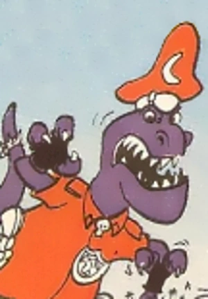 Tannensaurus was a large red allosaurus that lived in the Alternate 1991 that was in the position of a police officer. Upon seeing the DeLorean time machine, he tried to sell it to a science laboratory. As Doc, Jules, and Verne Brown escaped in the DeLorean, he attempted to latch on with his tongue but became injured in the struggle.