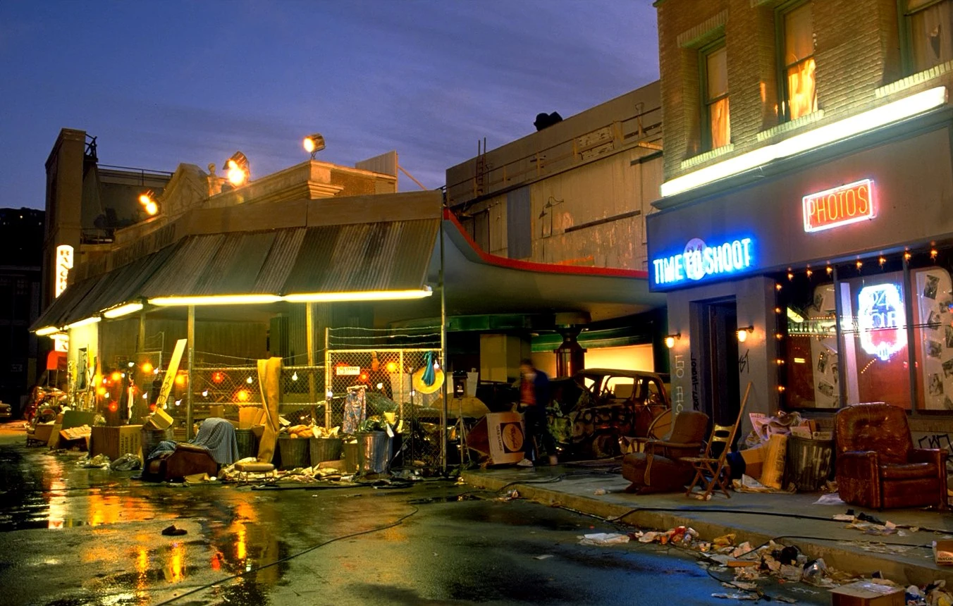 - The elaborate set for Courthouse Square in the 1985A "Biffhorrific" timeline is visible on screen for only 60 seconds in Part II, between the time Marty steps across the flattened Hill Valley greeting sign, and notices the Biff Tannen Museum. Many of the details were not evident in the film, but a set of photos on the Blu-ray edition of the Back to the Future trilogy show the wrecking yard in 1985A.